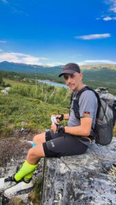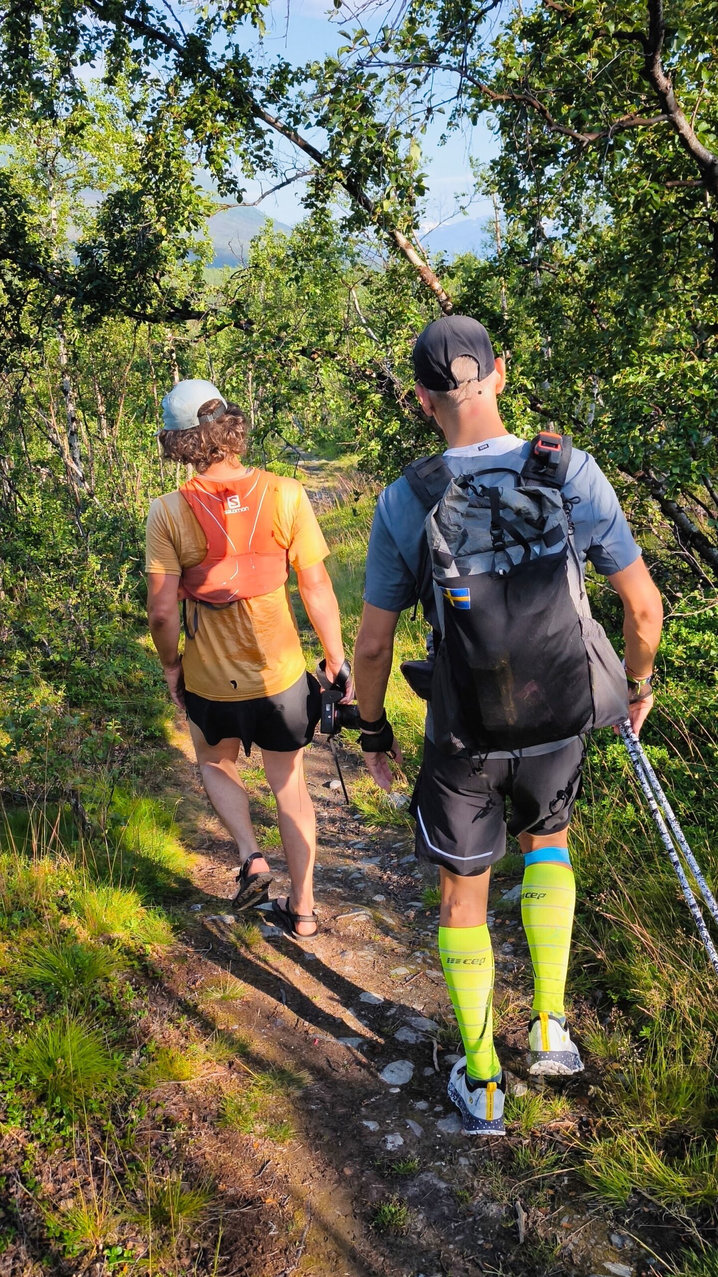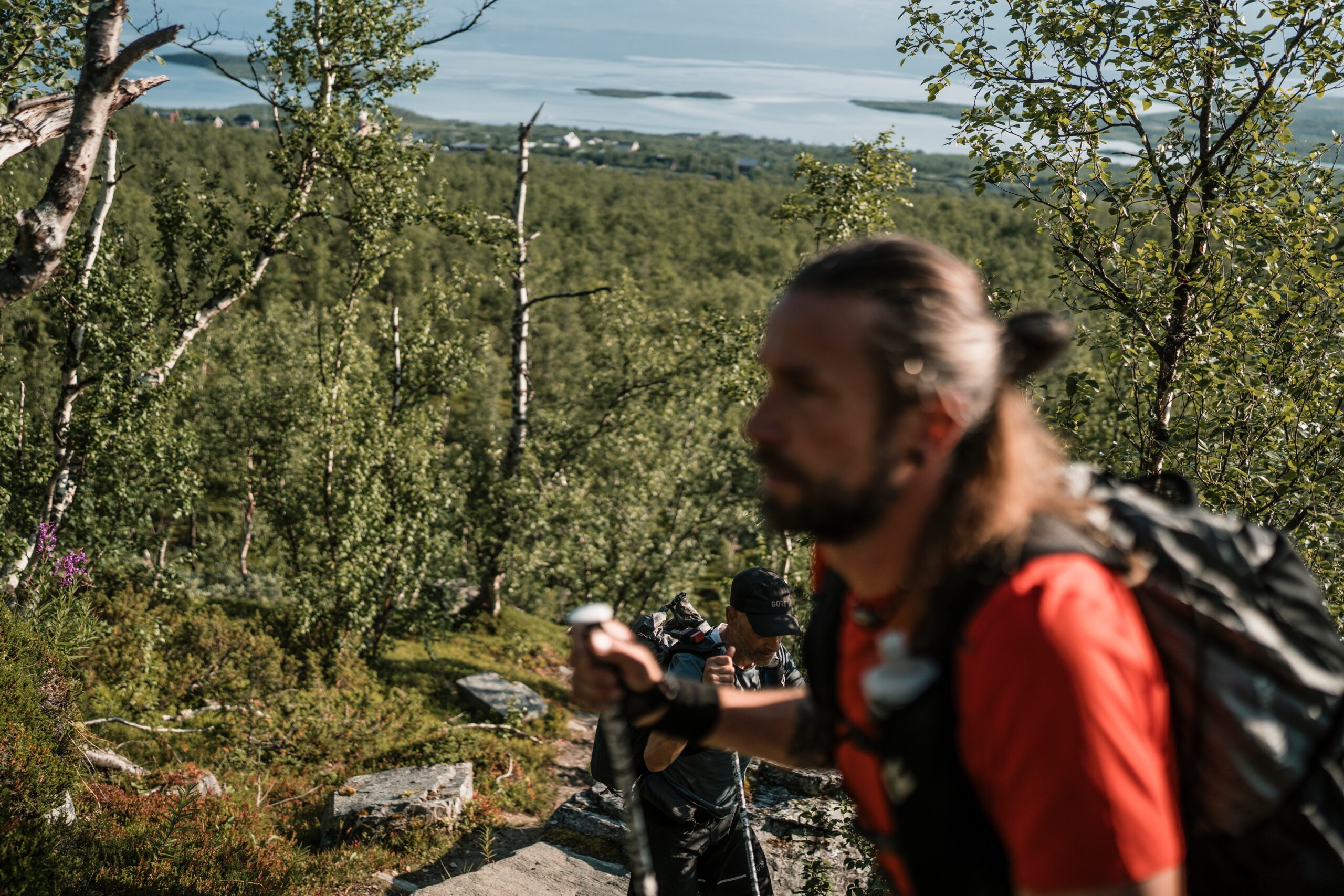 Teil unseres heutigen Plans auf den ersten 8–10 Kilometern ist, dass wir Fotos für unsere Sponsoren machen, für den Fall der Fälle. Und genau das machen wir 10 Minuten später erstmals, denn direkt hinter dem Hostel geht der Trail hinauf in die Berge in Richtung Abiskojaure. Wir scherzen, laufen erstmals wieder und es geht halbwegs gut. Die Beweglichkeit ist wieder da und es entstehen einige schöne Bilder bis zum ersten Peak, von dem wir einen überwältigenden Ausblick über Tal, Abisko und See haben. Eas für ein Land, ich liebe es einfach. Diese extreme Weite ohne Menschen ist echte Freiheit und wir genießen die Augenblicke.