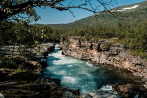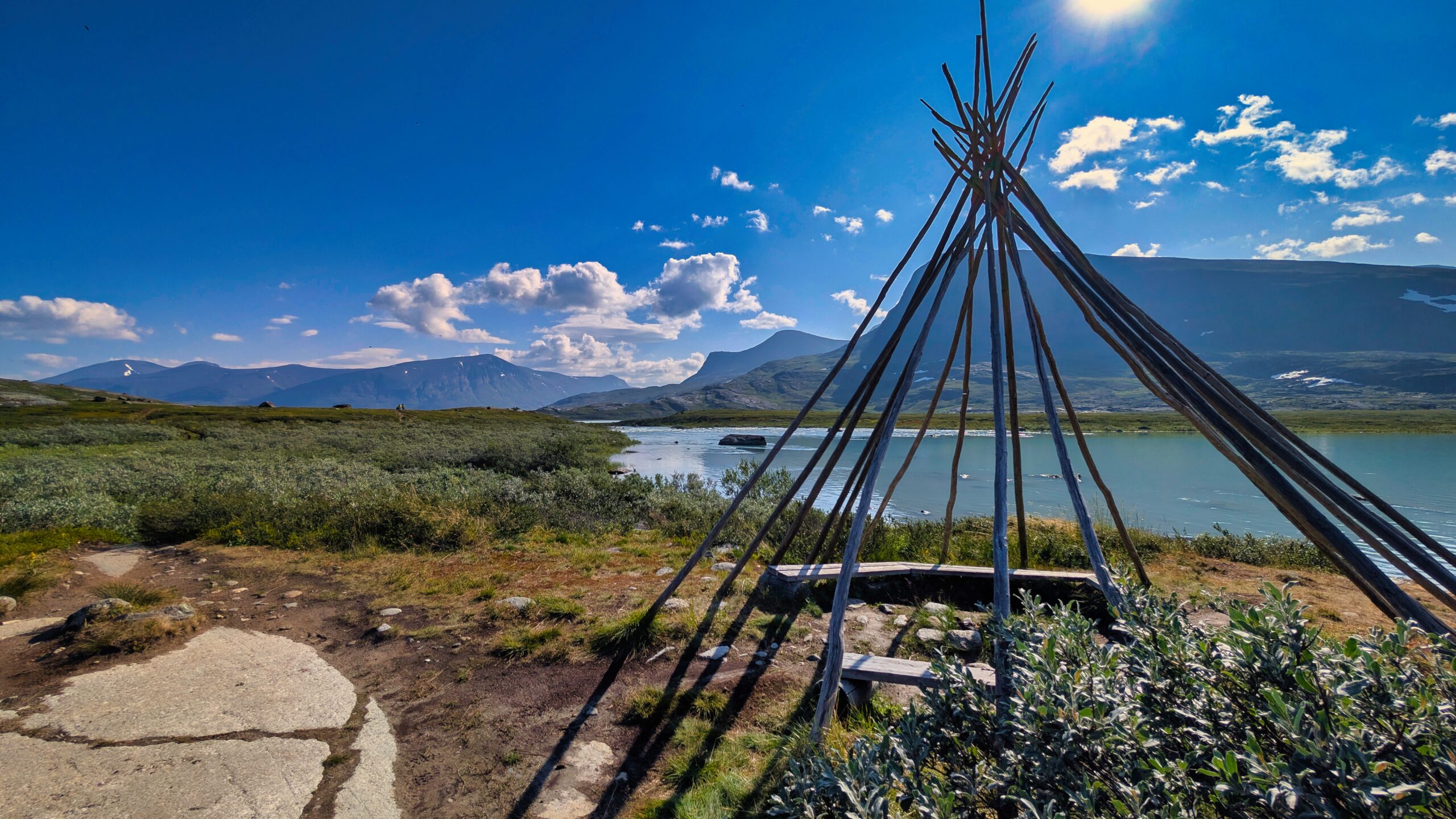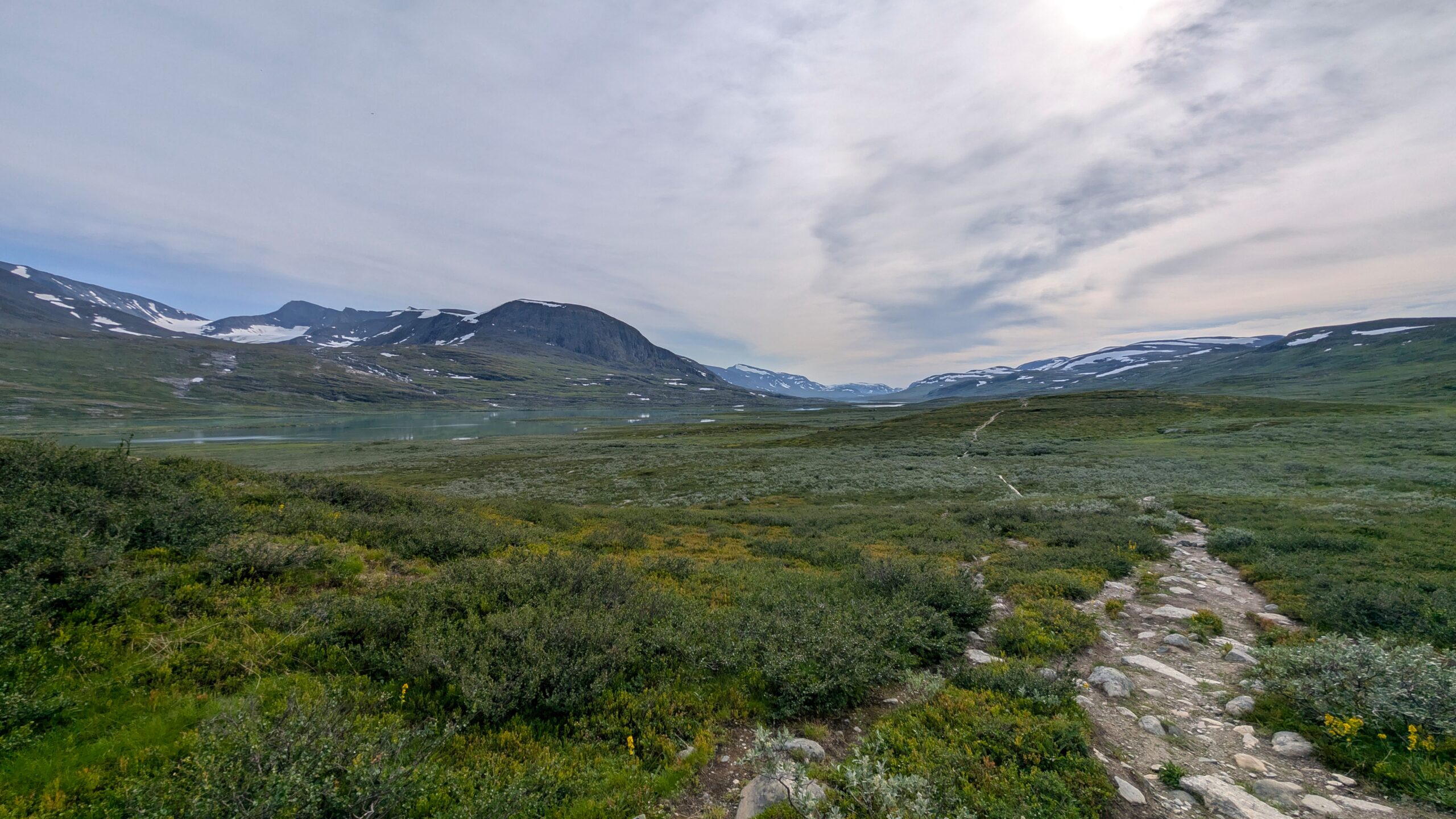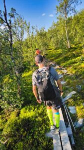 Hinter einem Weidezaunübergang sind wir im Sami-Gebiet an einem der vielen Seen, die azurblau in der Sonne funkeln, die sich nun doch wieder eingefunden hat. Der Trail besteht zu wesentlichen Teilen aus Holzbohlen und ist eigentlich recht einfach. Das Schienbein ist nun jedoch kochend heiß und der Schmerz kaum noch aushaltbar. Ich beschließe nun doch, eine Schmerztablette zu nehmen, da uns die Zeit davonrennt und wir befürchten, angesichts der vielen Wanderer kein Bett mehr in der Fjällstation zu bekommen. Das wäre schlecht, aus einem ganz einfachen Grund: Wir haben am Vorabend radikal unsere Rucksäcke ausgeräumt und den Schlafsack, die Isomatte und auch die Trekkingnahrung geopfert und Jacob mitgegeben. Was wir noch haben, reicht, um 2,5 Tage zu überleben. Dafür wiegt der Rucksack nun nur noch 5kg und das ist extrem angenehm gegenüber den 8 kg zum Start.
