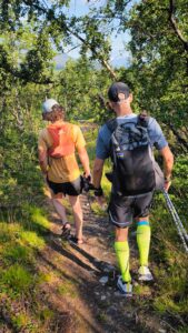 Nach einer halben Stunde ist das Gewitter ein wenig weitergezogen und wir wagen es, die Brücke zu überqueren. Der starke Regen ist geblieben und während wir auf der anderen Flussseite den Berg hinauflaufen, drehen wir erneut Videos, in unsere Tarps gehüllt. Das alles sieht so bescheuert und verrückt aus und muss festgehalten werden. Am Gipfel dieses Anstiegs schmerzt das Schienbein wieder massiv und ich mache mir langsam ein wenig Sorgen, wie weit der Schmerz noch gehen wird. Wäre das ein normales Training, hätte ich sofort abgebrochen. Schlau ist das nicht, aber ich will sehen, ob so ein Tag möglich ist. Denn ist er es, ist vielleicht auch der nächste Tag möglich und ich schaffe es über die Berge. Meine Hoffnung ist, dass die Verletzung auf dem Weg ausheilt. Vermutlich reichlich naiv. Mir fehlt die Erfahrung mit dieser Art Erfahrung einfach. In den nächsten Stunden werde ich auf die harte Tour dazulernen.