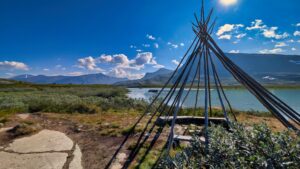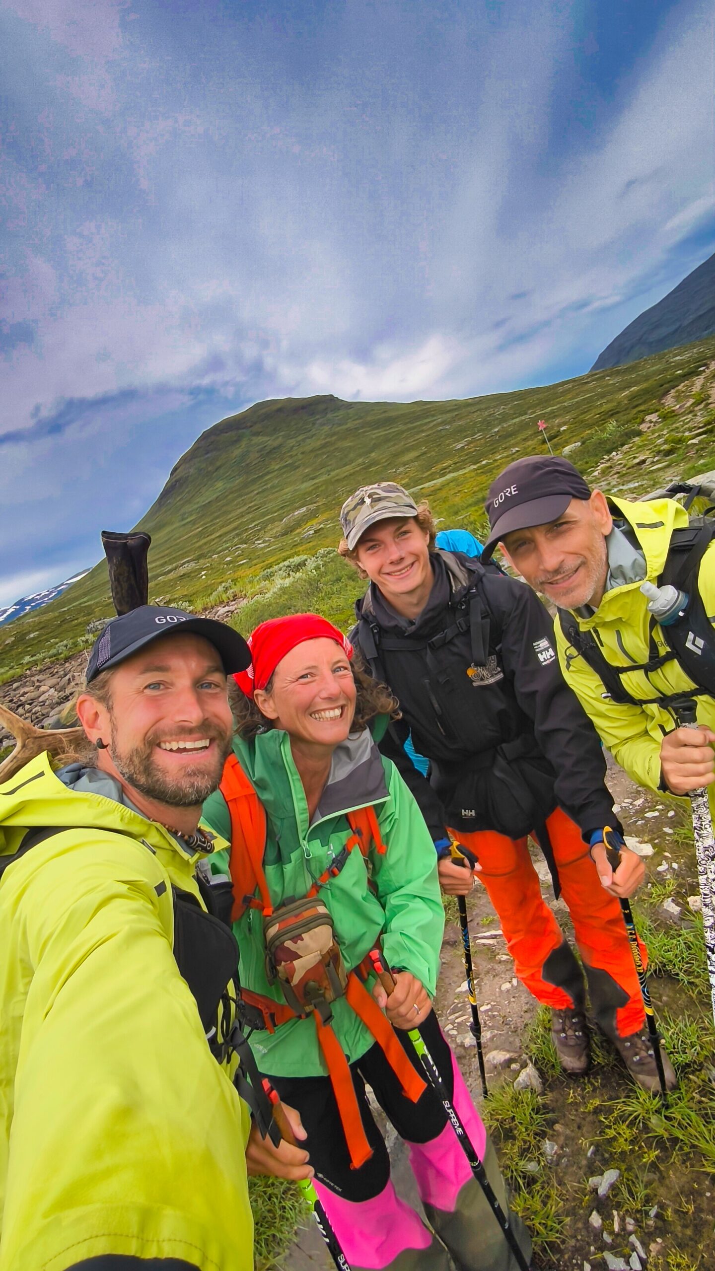 Zwischen den Bergen und einem der ersten Seen auf dem Gebirgsplateau treffen wir auf eine Mutter mit ihrem vermutlich gerade erwachsenen Sohn. Sie trägt ein riesiges Rentiergeweih und die beiden sind sehr interessiert an unserer Geschichte. Und so plaudern wir bestimmt eine halbe Stunde und erzählen uns, was jeweils vor uns liegt und wie es uns ergangen ist. In den letzten Tagen ist uns das oft passiert und das ist etwas, was wir beide aus den Alpen kaum kennen. Zu viele Menschen, niemanden interessiert die Geschichte des anderen, der Weg in die Zivilisation ist meist kurz. Hier ist das anders, hier trifft man auf ganz andere Menschen, die ihr Auto nicht 5km weiter unten am Hang stehen haben. Hier sind Menschen unterwegs, die sich mit den Elementen auseinandersetzen, oft tagelang unterwegs sind und für die ein Gespräch oft mehr wert ist als die Sonne am Himmel.   Es ist ehrliches Interesse und kein Geplänkel und blöder Smalltalk, ein Stück weit Therapie für beide Seiten.