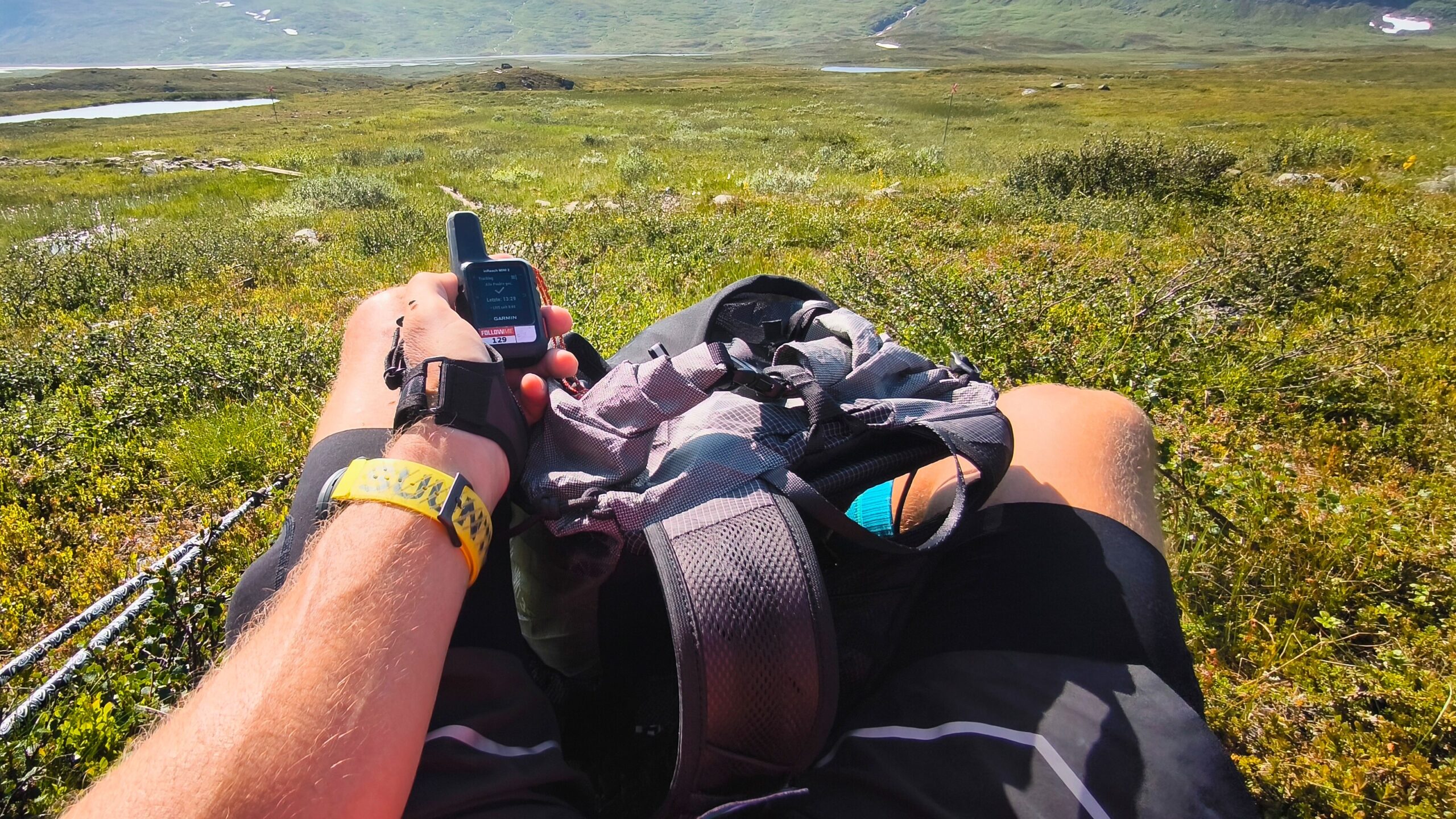Sonst gibt es hier wenig zu tun. Es ist 19:00 Uhr und ich versuche, ein paar Nachrichten über den Sat-Messenger zu verschicken, was normalerweise immer schnell klappt. Nur heute nicht, trotz wolkenlosem Himmel. Die Nachrichten tröpfeln durchs Netz und währenddessen denke ich darüber nach, was morgen ist, wenn morgen wie heute ist. Wieviel Sinn macht es, einen Tag wie heute zu wiederholen? Was ist, wenn die 50K morgen schon nach 10K schwierig werden? Was ist, wenn diese Verletzung sich weiter ausbreitet oder einen Ermüdungsbruch nach sich zieht, was vorkommt? Man liegt hier nicht stundenlang alleine auf dem Trail, dafür ist dieser Teil des Kungsleden zu stark bewandert. Das schreckt mich nicht, aber letztlich wird mich ein Heli evakuieren müssen. Wegen eines entzündeten Schienbeins! Wie bescheuert ist das denn?