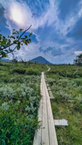Die ersten Höhenmeter sind geschafft und nun geht es auf Holzbohlen durch die sumpfige Landschaft auf den Haupttrail des Kungsleden. Nach knapp 2 Stunden verlässt uns Jacob und wird zurück ins Tal gehen, um die 120 km Berg, die vor uns liegen, zu umfahren. Um die 400km wird er dafür brauchen, so ist das hier eben.