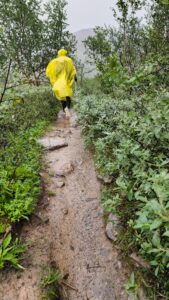Wir erreichen den Fuß der Berge und schauen uns den Himmel an. Schwarz. Direkt in Laufrichtung. Donner ist zu hören. Man muss kein Prophet sein, um zu ahnen, was uns bevorsteht. Jacob sprach am Morgen von einem herrlich sonnigen Tag und genau das war er bisher auch.  Aber er sagte auch, dass er uns ab und zu ein wenig anflunkern muss, um die Motivation hochzuhalten. So ein Quatsch, ich kann durchaus mit schlechtem Wetter umgehen, wenn ich die richtigen Klamotten anhabe.
