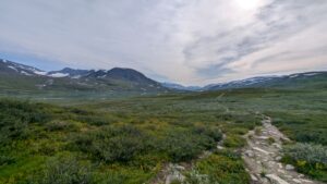Einige Kilometer später geht der flache Höhenweg in Richtung der Berge. Die STF-Station Abiskojaure haben wir inzwischen deutlich hinter uns gelassen. Nächstes Ziel ist die Station Alesjaure. Bis hierhin war der Trail in der Tat gut laufbar, nur hier und da steinig. Keine Herausforderung, Trail halt.